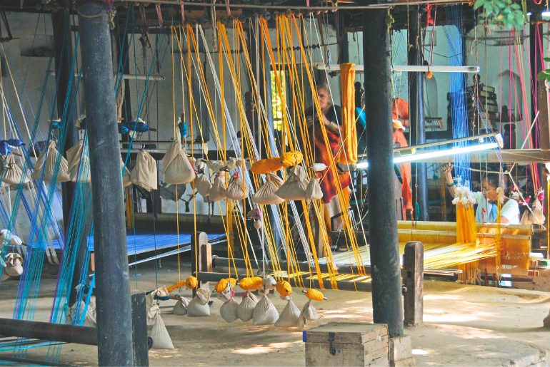 Over time, as industrialisation boomed in the state, the craft of weaving Maheshwari sarees declined. Thanks to the efforts of the Holkar family and the establishment of the Rehwa Society in 1979, the tradition was revived. Today, Maheshwari sarees are a sought-after piece of art, known for their elegance, unique motifs, and borders inspired by the carvings of Maheshwar’s temples and fort. The Rehwa Society still plays an important role in supporting and nurturing this craft, employing over 250 weavers and preserving the centuries-old tradition.